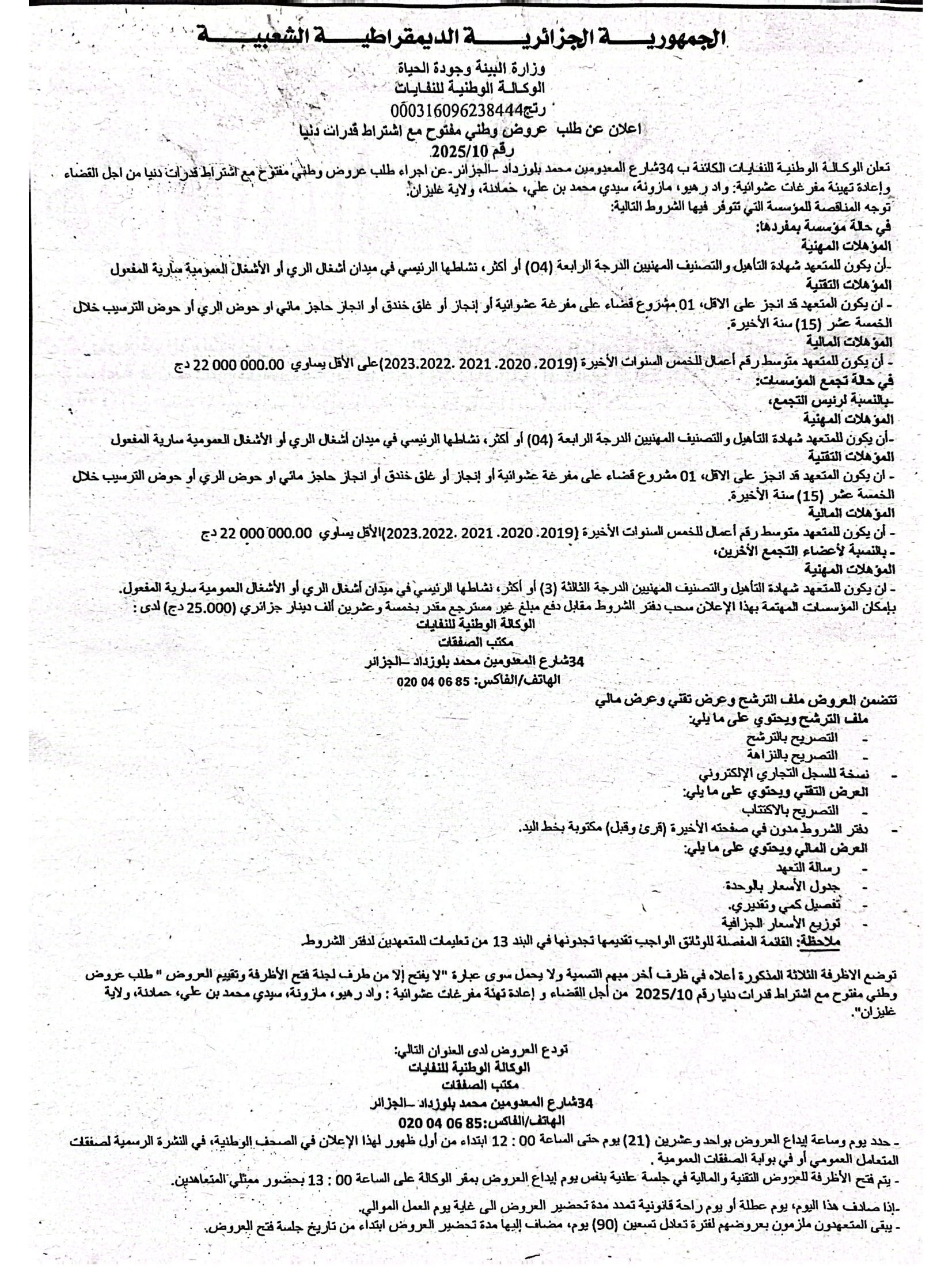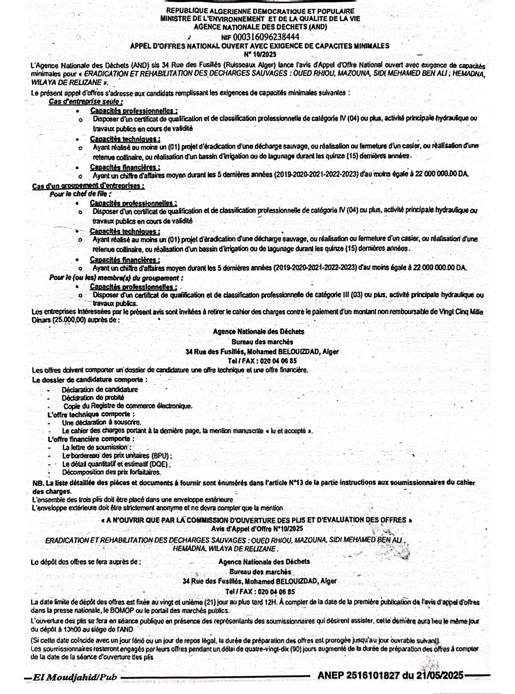 L’Agence Nationale des Déchets (AND) sis 34 Rue des Fusillés (Ruisseau Alger) lance l’avis d’Appel d’Offre National ouvert avec exigence de capacités minimales pour ERADICATION ET REHABILITATION DES DECHARGES SAUVAGES : OUED RHIOU,MAZOUNA,SIDI MEHAMED BEN ALI,HEMADNA, WILAYA DE RELIZANE