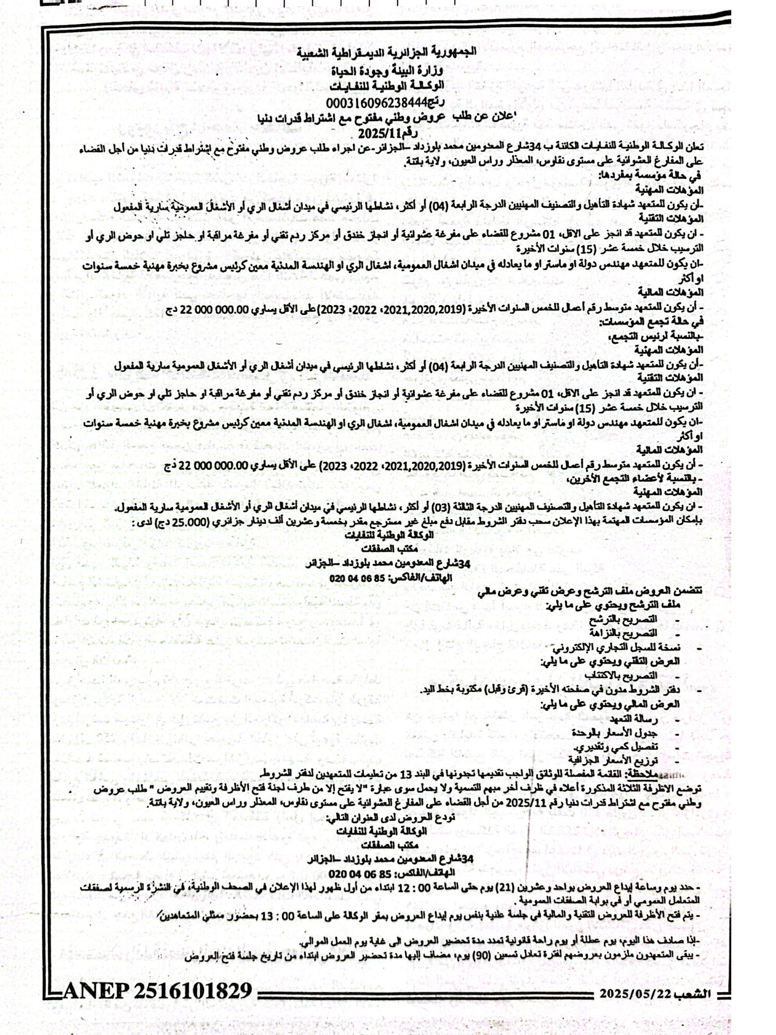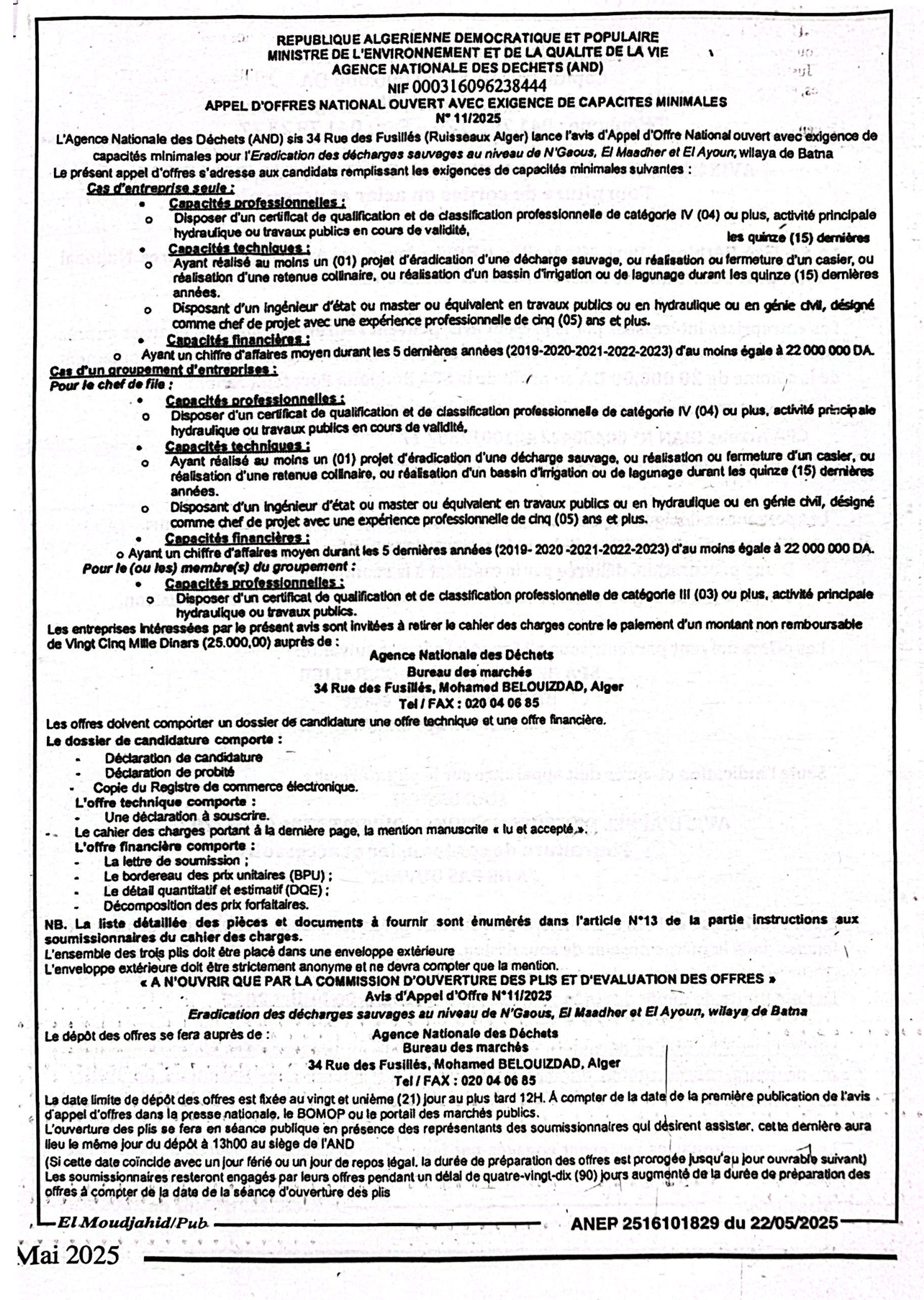 L’Agence Nationale des Déchets (AND) sis 34 Rue des Fusillés (Ruisseau Alger) lance l’avis d’Appel d’Offre National ouvert avec exigence de capacités minimales pour l’Eradication des décharges sauvages au niveau de N’Gaous, El Maadher et El Ayoun, Wilaya de Batna